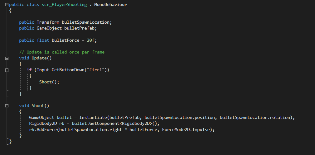 Also, I will make a new function which will be called shoot and in this function, it will handle everything to do with the player being able to shoot such as it will use the bullet prefab that I made earlier and will use the bullet spawn location transform component that I also made earlier to know the position of where the bullet will spawn and for the rotation of the bullets as well because it will move where ever the player is facing. The last thing I need to do in the script is to go into the update function and make an if statement that will tell it if the left mouse button is pressed it will use the shoot function that I just made and with this whenever the player presses the left mouse button, they will be able to shoot.