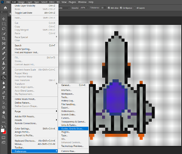 So firstly before I start to draw any pixel art in Photoshop I am going to set up a grid that will overlay my canvas and the reason I am going this is that it will help me see every individual pixel that is on my canvas. I am going to set up the grid to show every 1 pixel and by doing this I will know that I am drawing my pixel art 1 pixel at a time so basically this is like an outline to make sure I am drawing my pixel art by 1 each time.
