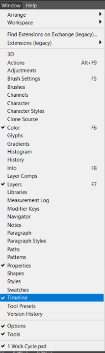 So, the first thing you need to do before animating anything in photoshop you need to get the timeline view to show on your screen so we can see the individual frames that I am going to animate so to do this you need to select the window button and look until you find the timeline and click on it and now the timeline view will appear on your screen and in the window where the timeline is you will get two options to be from and in this case I am going animate the walk cycle frame by frame. Also, you can see what these options look like below.