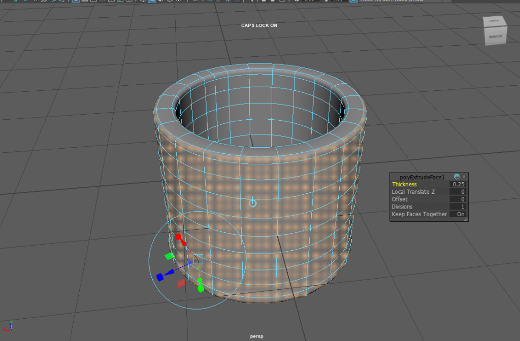 Now, I am going to extrude the cylinder and the reason I am going to do this is to make the cylinder thicker in size basically this will increase the size of the cylinder and to use the extrude tool you have to look at the top menu where all of the icons are select the extrude icon which can see in the image below or you can press the control key and the e key on your keyboard to extrude any object that you have selected when you select the extrude tool the object you have selected will change colour and next to the object there will be a window allowing you to change some settings and in this case I want to change the thickness of the cylinder to 0.25 when I press enter on my keyboard it will change the thickness of the cylinder.