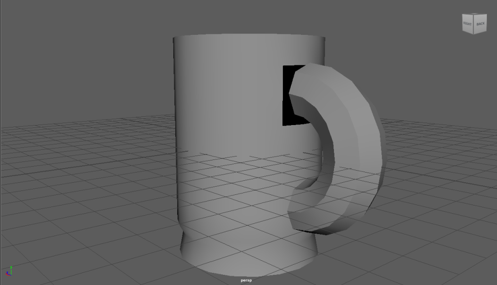 Now I am finally on the last step of how I created my mug and to attach my handle to my cylinder I could simply just drag the handle into the cylinder to look it’s connected however I want to combine these two shapes to make one complete object, and this can be done by that first I need to delete parts of the mesh on where the handle will go as seen in the image below then when I connect the two shapes together it will fill in this space.