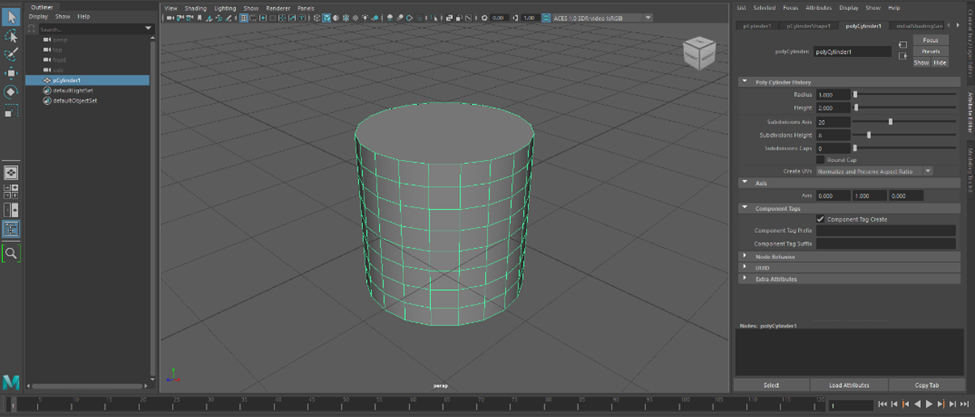 Now with that out of the way, I am going to walk through each step I did to end up with the final version of the Mug that I created. The first thing I am doing to do is place a cylinder shape onto my scene as most mugs tend to be shaped like a cylinder then I am going to need to adjust some of the settings of the cylinder I have created and this can be done in the attributes menu and the settings I am going to change are the subdivision height of the cylinder and what this means is that it will increase the amount of the green boxes that appear on the mesh/surface on that object and the reason you might want to increase this option because it will allow you to finely tune specific parts of the mesh/surface on the object you are making without making changes to the whole object.