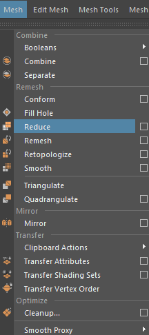 Next, to decrease the poly count of the current model I will use a tool called the reduce tool what this tool does is that it allows you to reduce the number of polygons on the mesh and this is exactly what I want because it will allow me to create a lower poly model and to use this tool you go to the top of the UI until you find the mesh tab and scroll down until you find the reduce option.