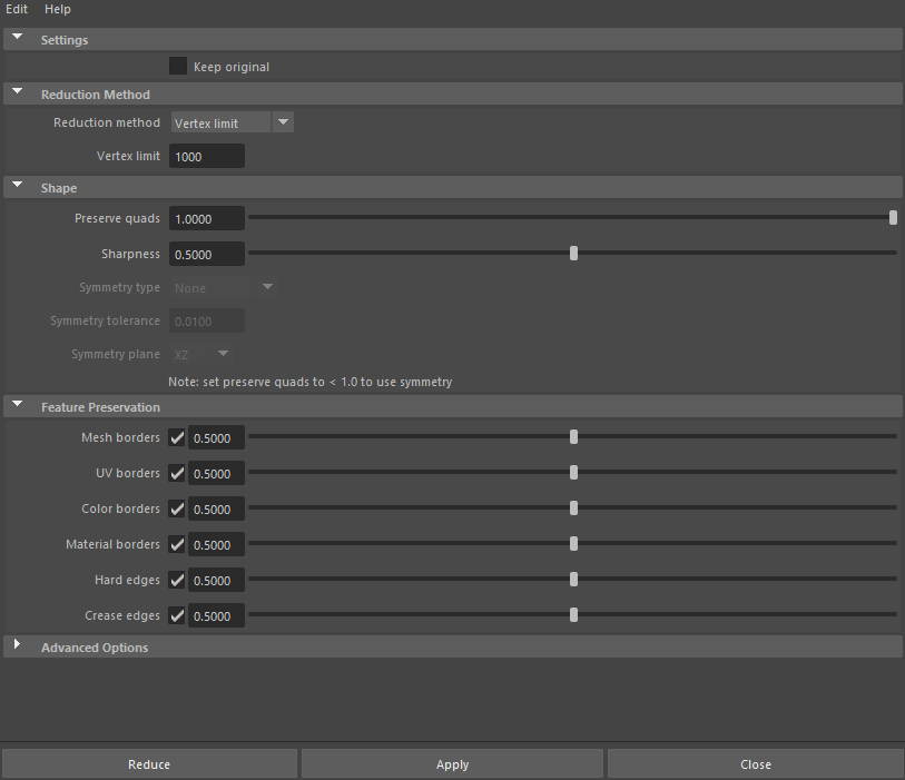 Next to the reduce option you will notice the empty square if you click on this it will open a new window which will allow you to change settings relating to the reduce tool such as it allows you to change the method of how the poly count will be decreased on the mesh which is the number of vertices that can be on the mesh, the number of triangles that can be on the mesh and lastly it can be done by overall percentage and you can edit many more options in this window.