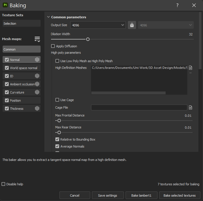 From here you will be able to change settings relating to the baking process such as selecting the high poly model that you want to use for the baking to do that scroll down until you find the high definition meshes section in this window and next to the large text box there will be a file icon and click on it to select the file location of the high poly model.