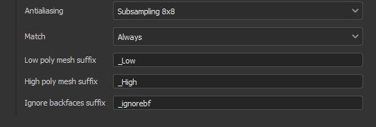 Also, if you scroll down further you will find a section which will contain the suffix for both of your low and high poly models the suffixes are the ones you used in the file name of your models and this is case sensitive so make sure if you use capital letters in your files input them into the suffix text boxes or it won’t be able to bake the model.
