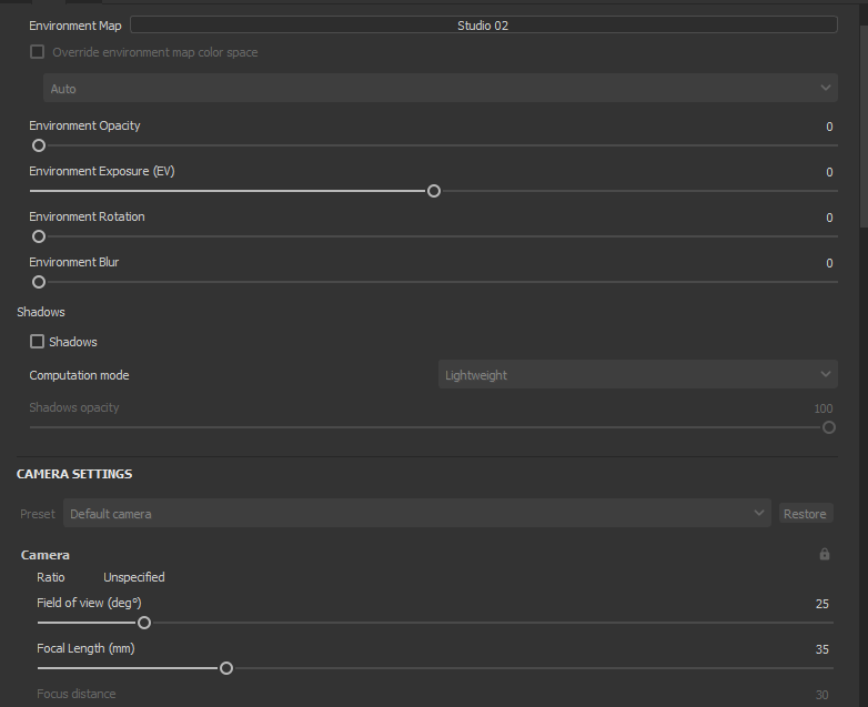 Now, that I have imported my model in substance before I begin the baking process I am going to change some of the display settings and the first thing I am going to change is the environment map which is the background that will appear behind my model in Substance Painter I selected the studio 2 and I set the environment opacity to zero so it will just be a blank background that will have lighting that will shine on the model.