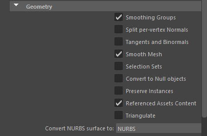 The options that I chose are in the geometry tab in this window and I selected the smoothing groups, smooth mesh and lastly the referenced assets content options what these options will do is export the smooth mesh applied to the model.