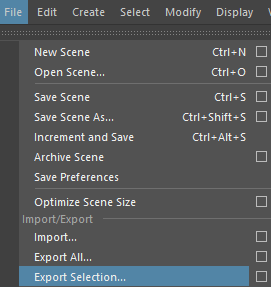 Now, with that out of the way, I will show you the process of exporting models from Maya, firstly you need to select the model you want to export in the outliner and then go to the file tab which is at the top of the UI then scroll down until I find the export selection option then select it.