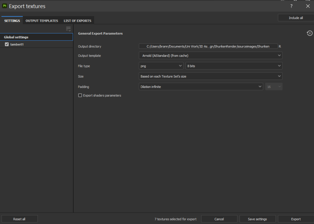 Now I can export my textures and to do this I just need to go back to the first window by clicking on the Settings button and click on the export button which is at the bottom of the window and now it will have exported all my textures and saved them to the location that I set and now I will be able to use them in Maya.