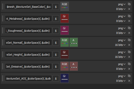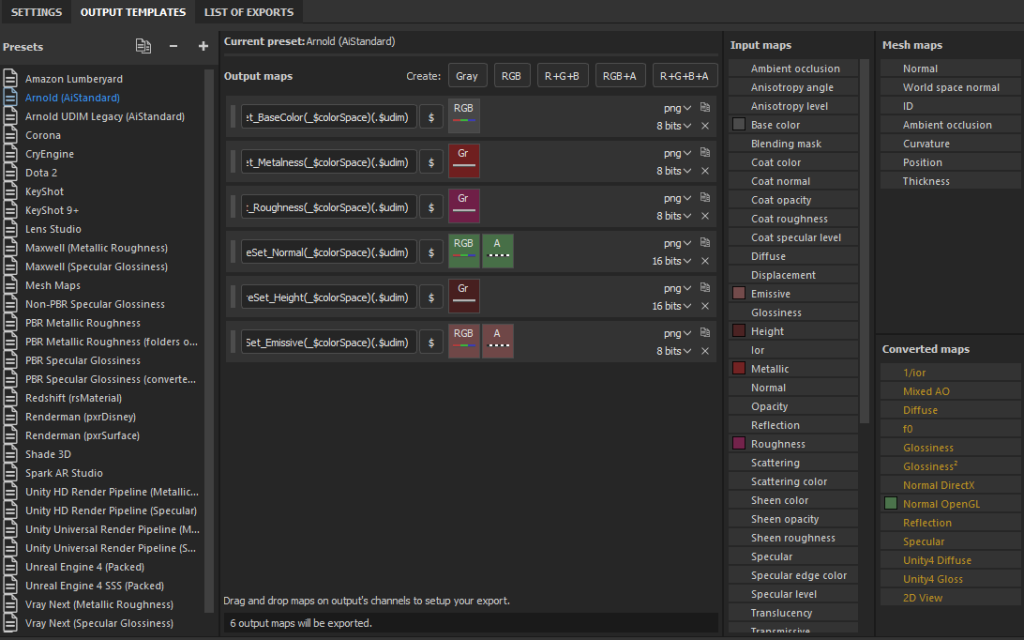 However, I can’t export my textures just yet because by default this template doesn’t include ambient occlusion and this is where in 3D models it is a shading and rending technique used for calculating how exposed each point in a scene is to ambient lighting. However, there is a way to add ambient occlusion to this template and to do that you select the output templates button which is at the top of this window and scroll down until you find the Arnold (AiStandard) template and click on it and it will open a new window which will look like this.