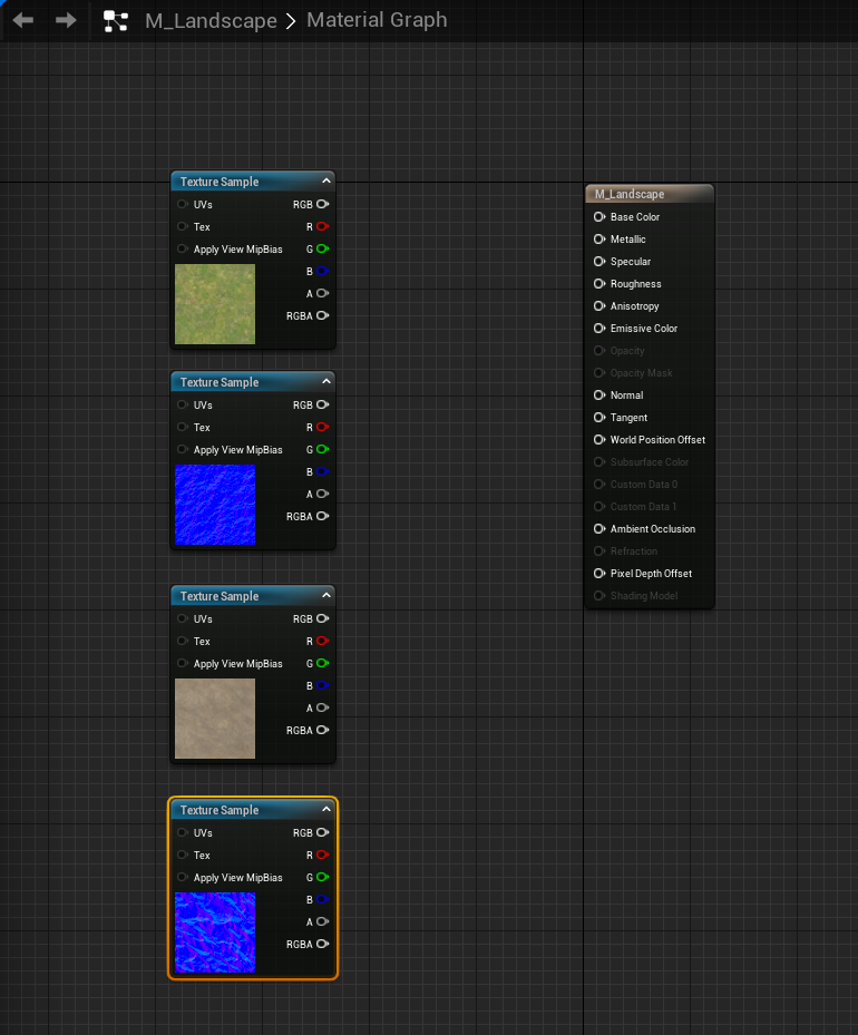 Now, I am going to need to import some textures that I want to use for the ground for my landscape, and the textures I am going to use from the starter content are the grass and gravel textures also, when importing textures into the material editor you should import the normal map for that texture as well as this affects how the lighting affects the look of the material and texture to make it look more 3D instead of flat 2D texture and to import them just simply drag them into the material editor.