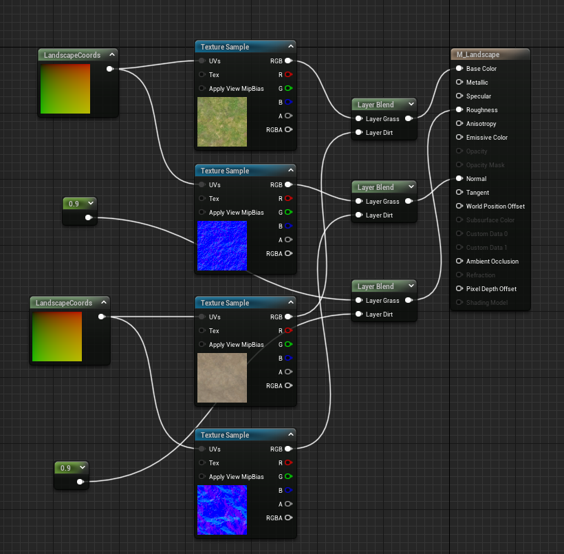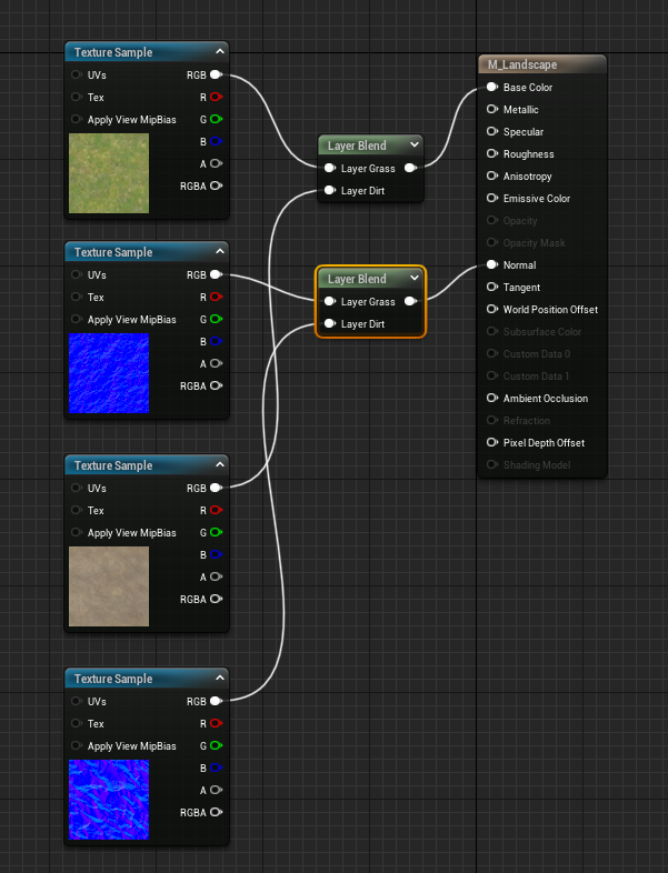 I have to repeat this process from the normal maps of these textures, so I am just going to copy and paste the layer blend node that I just created and then do the same as I just did, however, the only difference is that I will end up plugging them into the normal map node on the material itself.