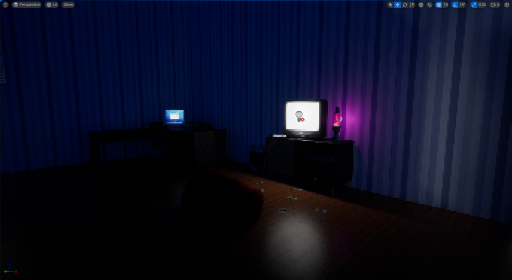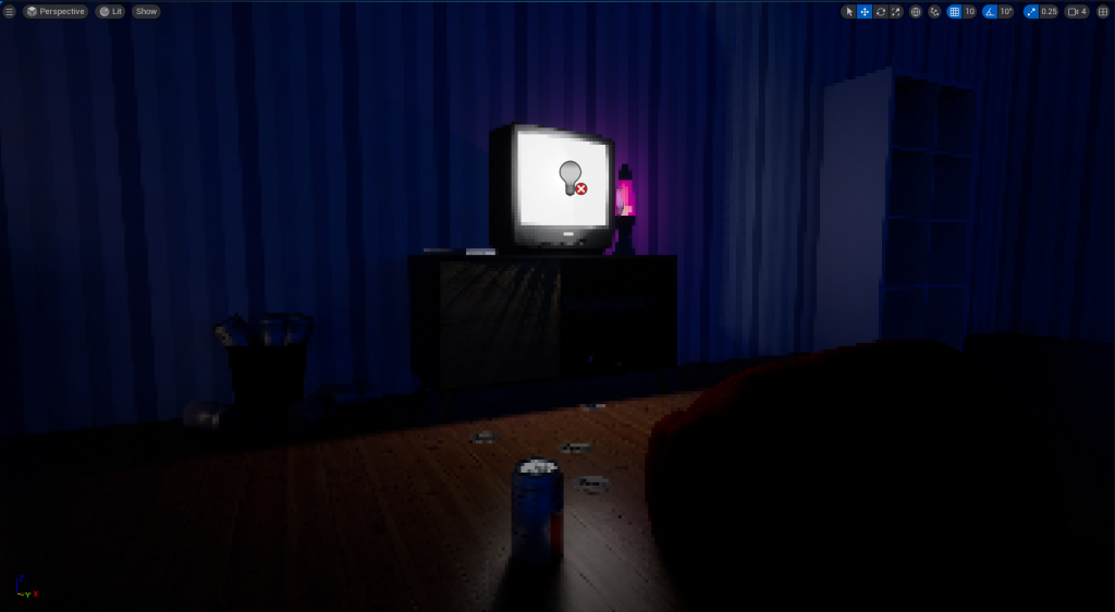 That’s why I chose dark blue instead of it being pitch black with dark blue, and you can still make out some of the details in the environment. also, I have put other light sources in the environment, such as the tv itself, as in real life, they can generate some light from it, and I wanted to make it seem like it was glowing and lighting up the surrounding area, so I used a spotlight over the tv to accomplish this. Also, the last thing for the area that provides a major light source is the lava lamp next to the tv as it will produce some light as well but not as strong as the tv light will be.