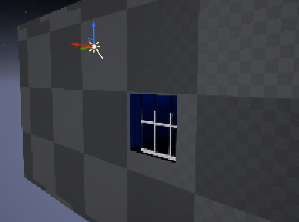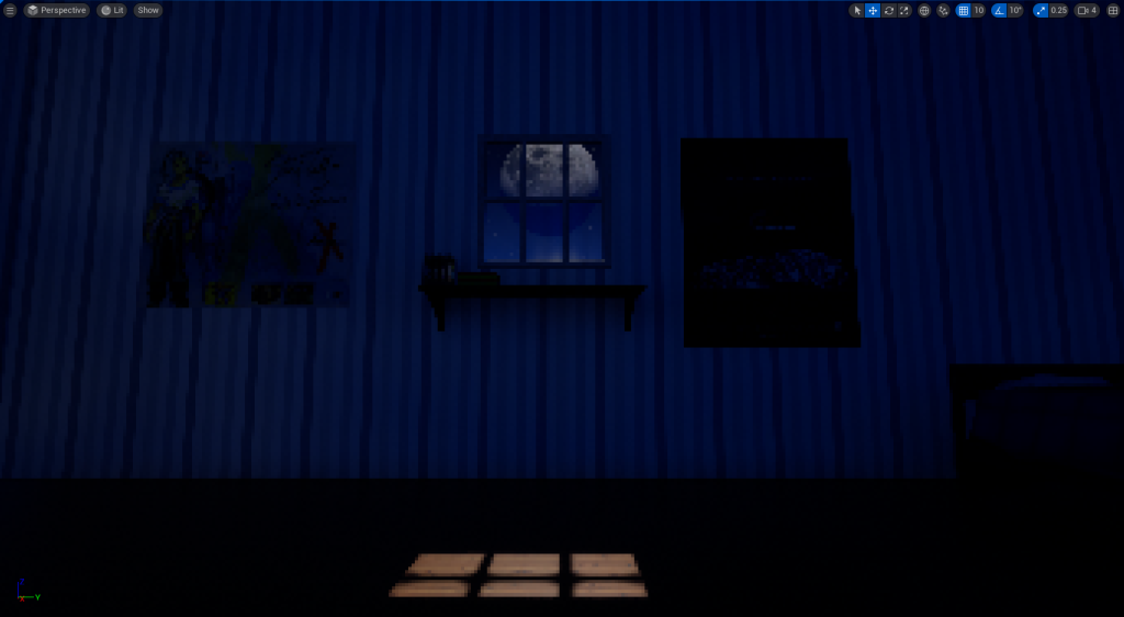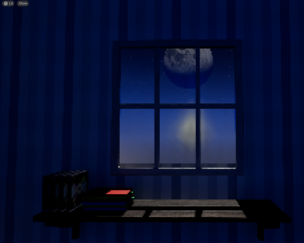 Lastly, for lighting in this scene, I wanted to make it look like the moon is shining light on the window, and it will reflect on the room floor to provide some lighting for that area. I chose to do this because it will visually stand out and provide some lighting as well. I set up the lighting for this because I used a directional light and cut out a hole on the other side of the window so the light could get through, and then I adjusted it until it was something I liked.
