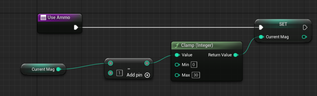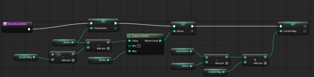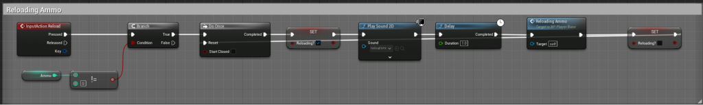 To add this to the game, I created functions allowing the player to use ammo and another one for what will happen when the player reloads their gun. This will check the player’s current ammo and set it to the new amount they should have. Lastly, I have set it up to allow the player to press a key or a button on their controller to reload their gun.