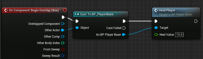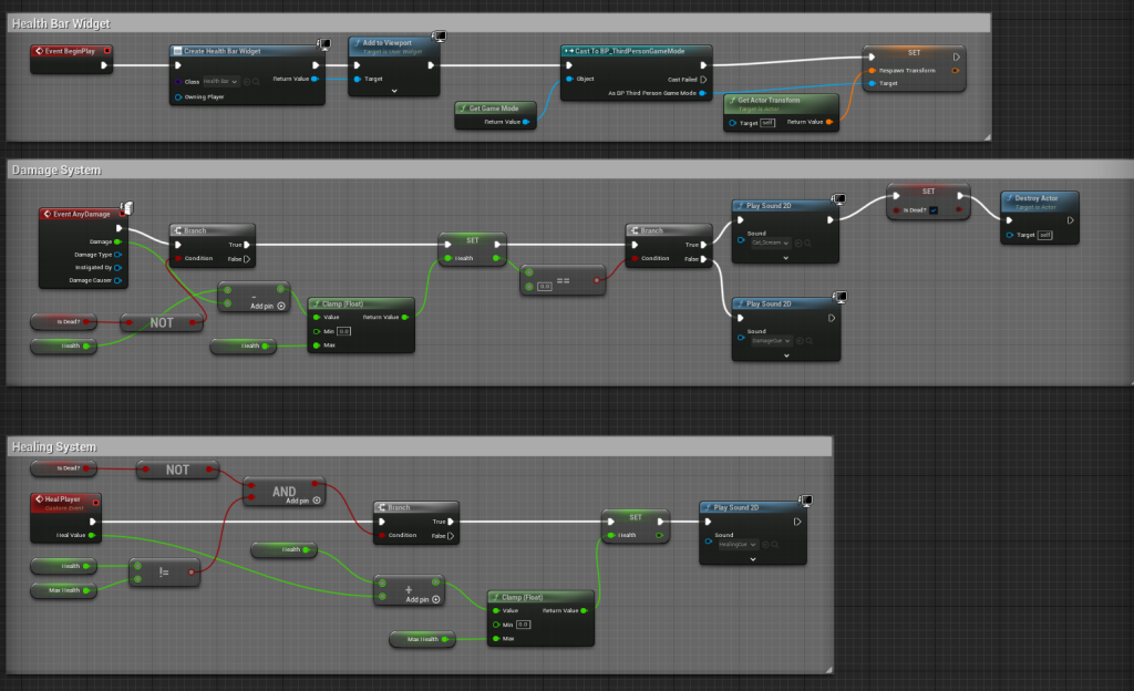 Also, for the prototype, I created a basic health system with a health bar and pickups that you can collect, allowing you to restore health when the player runs into them around a map. However, I ended up redoing the health system later on as there was a better and more efficient way of doing it.