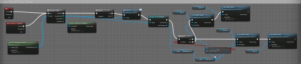 After the prototype was finished, we wanted a system where the player could pick up various weapons and items that the player would find on the map. How it works is that when the player pickups up an item, the one that was right in from of them will get destroyed now will appear in their hand or whatever you want them to appear, which can be set up by adding a new socket to the player model.