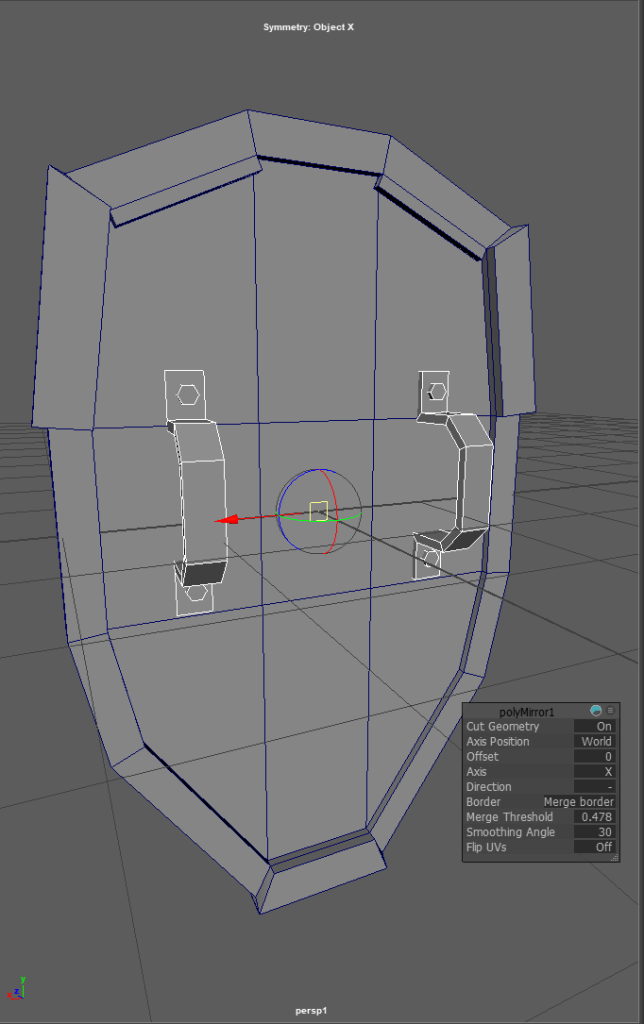 Lastly, for the strap, I increased the thickness of it so it’s not flat anymore then I just made a simple bolt as mentioned before, added it to the strap and some of the fronts of the shield then I just used the mirror tool to duplicate the strap so there is two of them on the back.