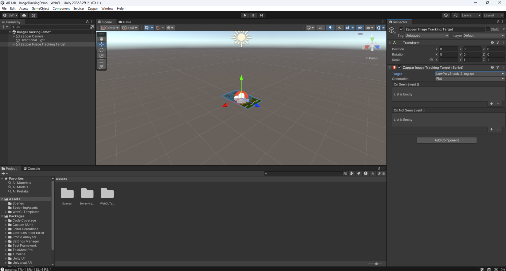 To do this I click on the Zappar camera in the Unity hierarchy and from there in the inspector I go down to the bottom and just drag the Image tracking target into anchor origin on my camera.