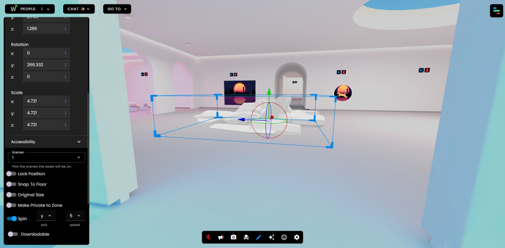 Now, it will be added to your scene and now you have to go into edit mode to adjust the position, scale, change the rotation etc. To do this on the bottom of the screen there is a blue pencil button and clicking it will put you into edit mode so I added various models I created around the environment.