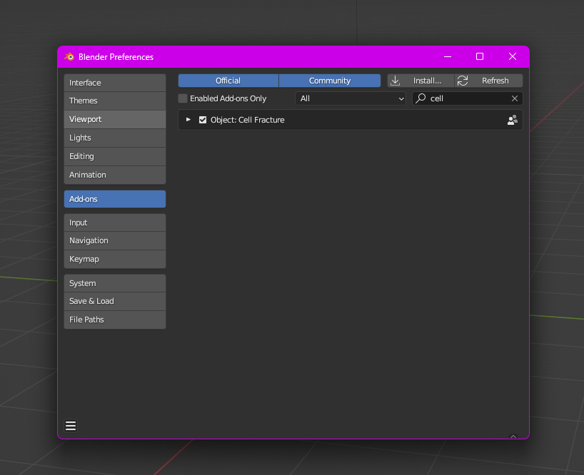 Now, I am going to look at the shatter object effect I created to do this you will need to enable to the cell fracture add on in Blender to do this go to preferences which is in the edit tab and from there it will open the preferences window and click the add ons button and from there you can search for the cell fracture add on and install it.