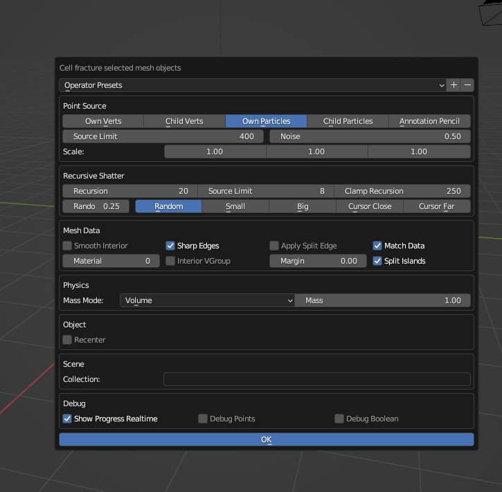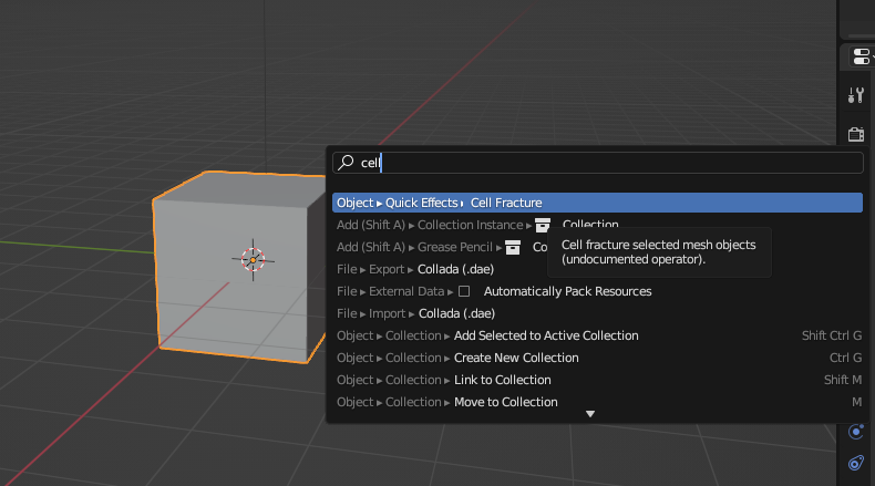 Next, I will select my object and press F3 on my keyboard and search for the Cell Fracture add on and clicking on the cell fracture button will open a new window allowing you to adjust the setting of the add on to your liking and once your done adjusting it just press the ok button now you will notice your object has alot of cuts in the model.