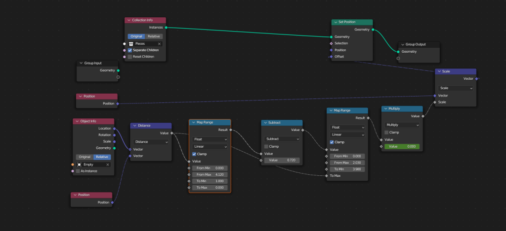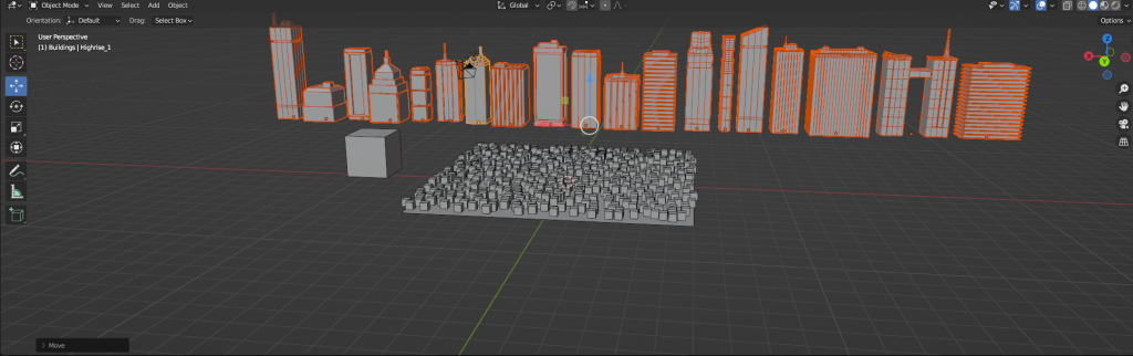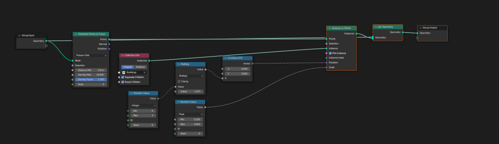 Lastly, with the geometry nodes I used them to randomly generate a cityscape based on particular parameters such as how close the buildings can be because if they were too close together the models could clip into each other and in actual city the buildings would be somewhat spread apart from each other also I made sure it would use all different types of buildings so it had alot of variety to it.