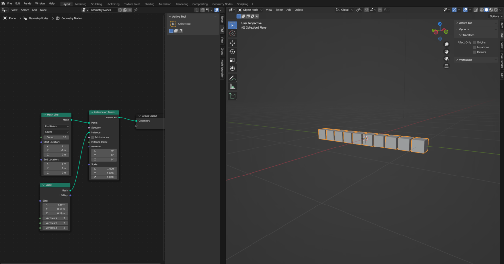 Now, it’s time to start using the geometry nodes so I will go the geometry nodes tab in blender and I will add a plane into my scene and this will be where all my nodes will be used on I can just drag the cube and any other objects I might need into this and use them and from here I will just add a bunch of variables to make the effect the way I want it and the last thing I need to do is setup some key frames so it’s a actual animation to do this I will use the sequencer and depending on what the multiply node is set to this will change the effect so on the first frame the value will be set to 0 and depending on the frame I will just change this value to get the effect you see in the video.