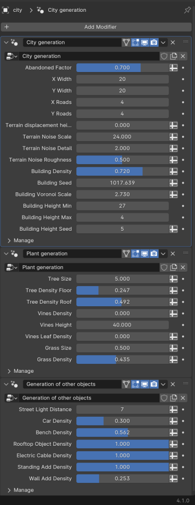 Since I lost alot of time trying to create it in Unreal I needed a quick way to create a environment when looking into this I found an abandoned city generator and with this I could customise very options such as how long the roads will be, how much foliage there would be, how much grass there would be. Just changing some options in Blender it would have been better if the environment was completly original to me however with how many options there I would still be able to create something completly unique to how I wanted the city to look.