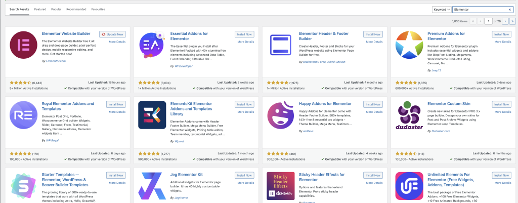 Firstly, you need to install Elementor to use it and this can be done by navigating to plugins section in WordPress and clicking on add new. Then this will open a new window with many plugins in it to pick from and to get the Elementor plugin you can search for it and the icon for it should look like the one at the top left.