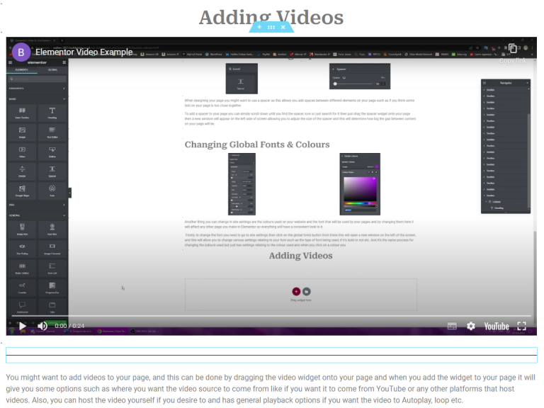 You might want to add videos to your page, and this can be done by dragging the video widget onto your page and when you add the widget to your page it will give you some options such as where you want the video source to come from like if you want it to come from YouTube or any other platforms that host videos. Also, you can host the video yourself if you desire to and has general playback options if you want the video to Autoplay, loop etc.